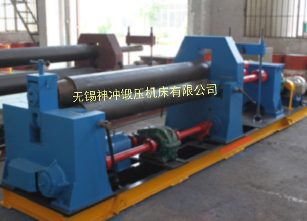 SW11X-B機械水平下調式三輥卷板機的上輥可作升降運動,兩下輥可單獨或同時水平移動,每個下輥輪流執(zhí)行下輥與側輥的功能,即先后構成兩種非對稱式三輥卷板機,從薄板到厚板,從預彎端部到卷圓一次性完成整個工序,另卷制錐筒極為方便。