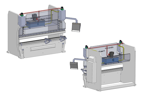兩種機型的設計原理不同,導致折彎滑塊兩邊保證同步的結(jié)構(gòu)不同。扭軸折彎機是采用扭力軸鏈接左右擺桿,形成扭力軸強迫同步機構(gòu)對兩側(cè)油缸上下運動,所以扭軸折彎機是機械式強制同步方式,同時滑塊的平行度無法自動檢查與調(diào)解。電液折彎機則是在滑塊或床身上安裝光柵尺,數(shù)控系統(tǒng)可以通過光柵尺隨時反饋的信息分析滑塊兩邊的同步情況。如果出現(xiàn)誤差,數(shù)控系統(tǒng)會通過比例電液伺服閥進行調(diào)整,使滑塊兩側(cè)行程同步。數(shù)控系統(tǒng)、液壓控制閥組、光柵尺構(gòu)成了電液折彎機的反饋閉環(huán)控制。