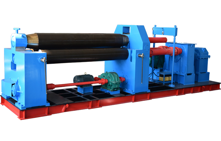 卷板機(jī)主要可分成兩部分,運(yùn)行部分和傳送部分。這兩部分都焊接在底部托盤上。運(yùn)行部分由左右軸承座、一個(gè)上輥、兩個(gè)下輥和其他配件組成。傳送部分主要由主電動(dòng)機(jī)、減速機(jī)和其他配件構(gòu)成。